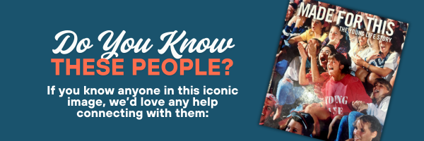 Do you know any of the people in this photo? This photo has been used in countless ways throughout Young Life’s recent history and was an iconic image for the pure fun and joy that happens at Young Life. We’d love to connect with the people in this photo to see if they’re still involved in Young Life. If you know anyone in this picture, could you reach out to our team? (Email ktankersley@sc.younglife.org)